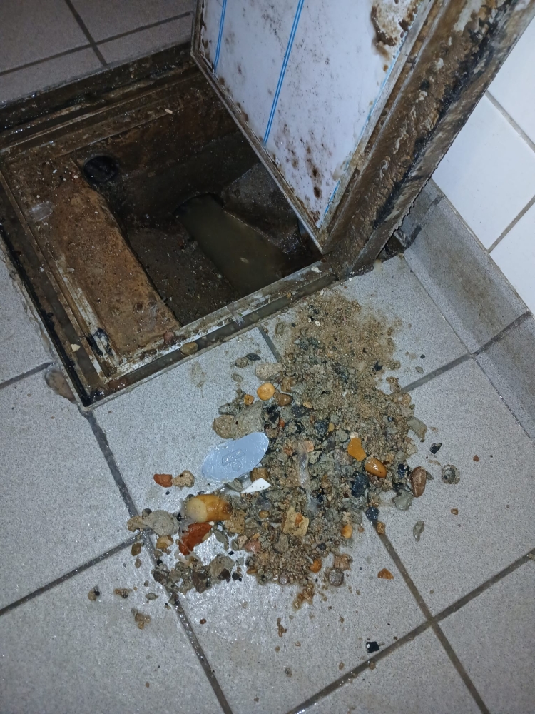 Nous avons commencé par procéder à un débouchage de la bonde de sol, dans laquelle nous avons trouvé de la nourriture et des cailloux présents dans le réseau.