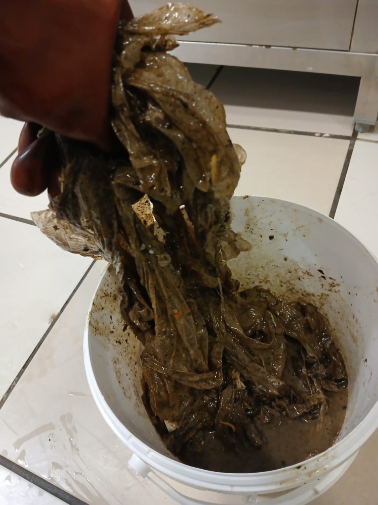 NOVEAX votre entreprise d'assainissement à réalisé le débouchage hydrocurage d'une bonde de sol à Miribel. Nous avons pu retirer des morceaux de vaisselle et une quantité importante de film étirable qui obstruait les canalisations.